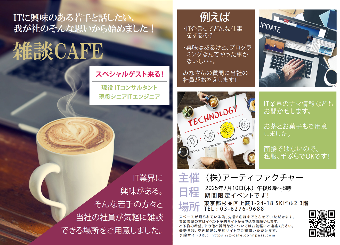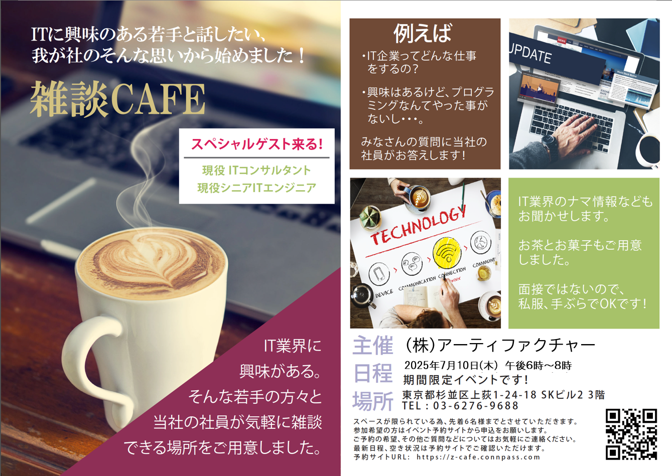 申し込みはこちら NEWS & TOPICS 2025.12.05 「雑談Cafe」第31弾やります! 【予約制】 2025.07.02 「雑談Cafe」第30弾やります! 【予約制】 2023.09.21 「雑談Cafe」第29弾やります! 【予約制】 2023.06.23 「雑談Cafe」第28弾やります! 【予約制】 2023.04.12 「雑談Cafe」第27弾やります! 【予約制】 2022.10.06 「雑談Cafe」第26弾やります! 新型コロナ対応版【予約制】 SCHEDULE 営業スケジュール 雑談CAFE 第31弾開催 2025年12月 水曜日 #102:2025年12月10日(水)18:00 〜20:00 CONTENTS MENU コンテンツメニュー 雑談Cafeでは、IT業界未経験者の方や、 現役のITエンジニアの方など、 ITに興味のあるさまざまな方向けの コンテンツを用意しとります。 SNACK MENU スナックメニュー お茶のお供に、スナック菓子、おせんべい、 チョコレートなどをご用意しております。 持ち込み大歓迎です! 運が良ければ社員のお土産なんかもあります。 GALLERY 申し込みはこちら